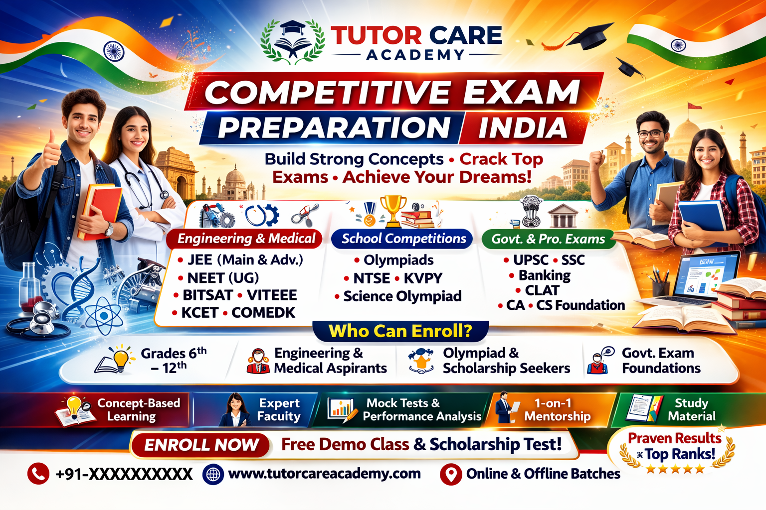 At Tutor Care Academy, we provide strong foundation-based and exam-oriented coaching for major Indian competitive exams. Our structured learning approach helps students build deep conceptual clarity, analytical thinking skills, and exam confidence from an early stage. We focus on long-term academic success through consistent mentoring and performance tracking.